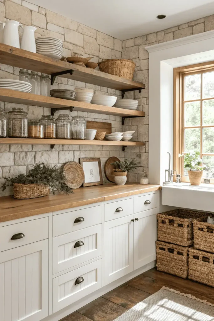 Farmhouse kitchen decorated with rustic wooden accents, vintage accessories, neutral tones, and open shelving, creating a warm, inviting, and timeless atmosphere.