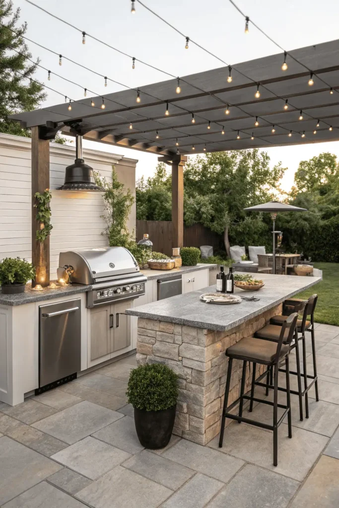 Outdoor kitchens face weather year-round, so choose stainless steel, concrete, stone, or treated wood for long-lasting performance.